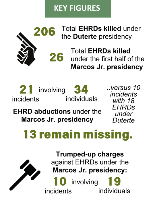 The pervasive culture of impunity fostered by the Duterte administration is being solidified by the weaponization of Duterte-era policies and laws against EHRDs under the Marcos Jr. regime. The National Task Force to End Local Communist Armed Conflict (NTF-ELCAC) continues to systematically terror tags and endangers the lives of EHRDs, while the Anti-Terrorism Act of 2020 is being used to falsely charge and arrest legitimate defenders. The Marcos Jr. administration has also seen a troubling intensification of militarization across rural communities purportedly as a counterinsurgency strategy that disproportionately targets communities resisting environmentally destructive projects. Alarmingly, aerial strikes, drones, and bombings persist in rural communities across at least 10 different regions.