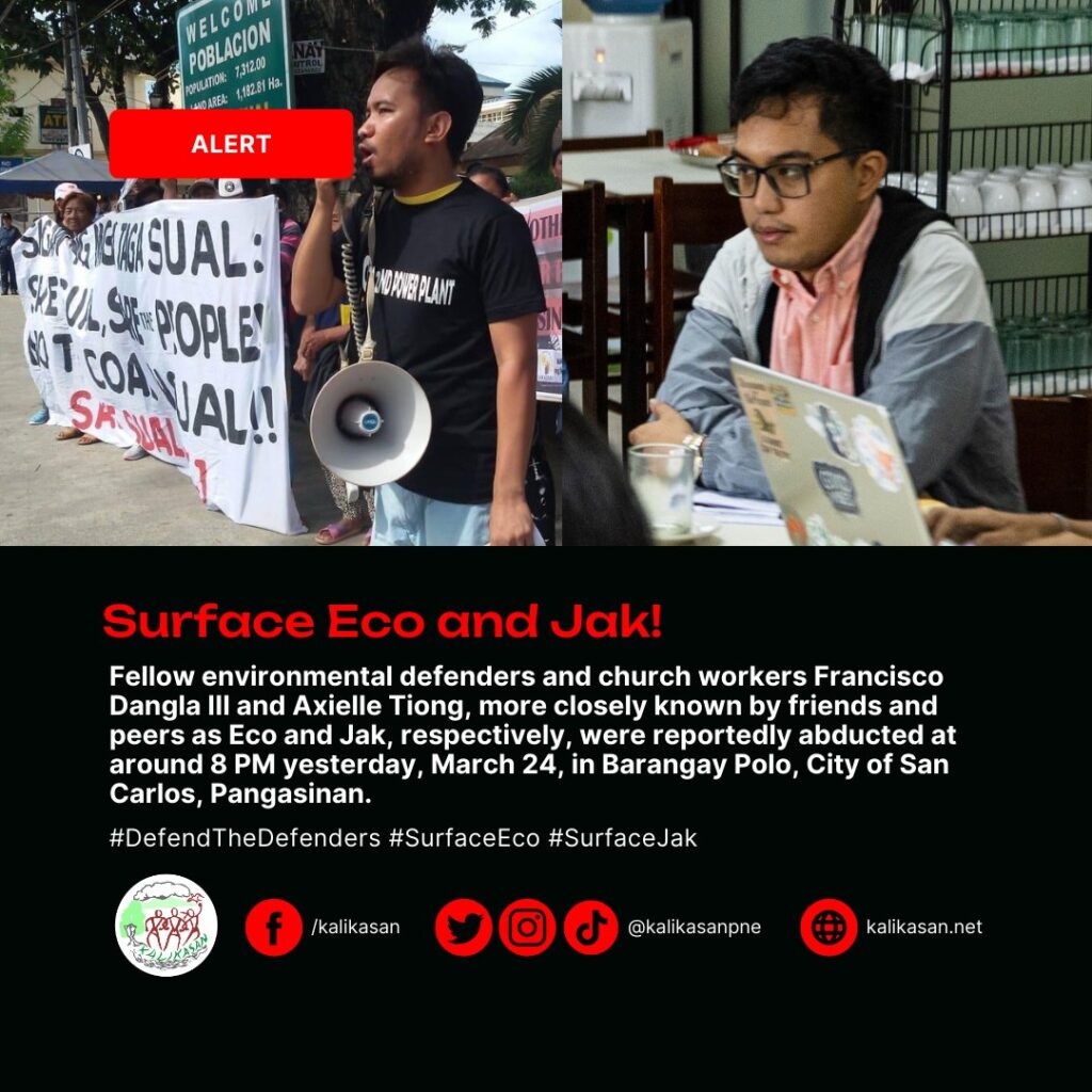 Dangla and fellow environmental activist Joxelle Tiong were abducted in Pangasinan last year. Both have been outspoken critics of environmentally destructive projects in their province, including black sand mining, incinerator project, and nuclear power plant.