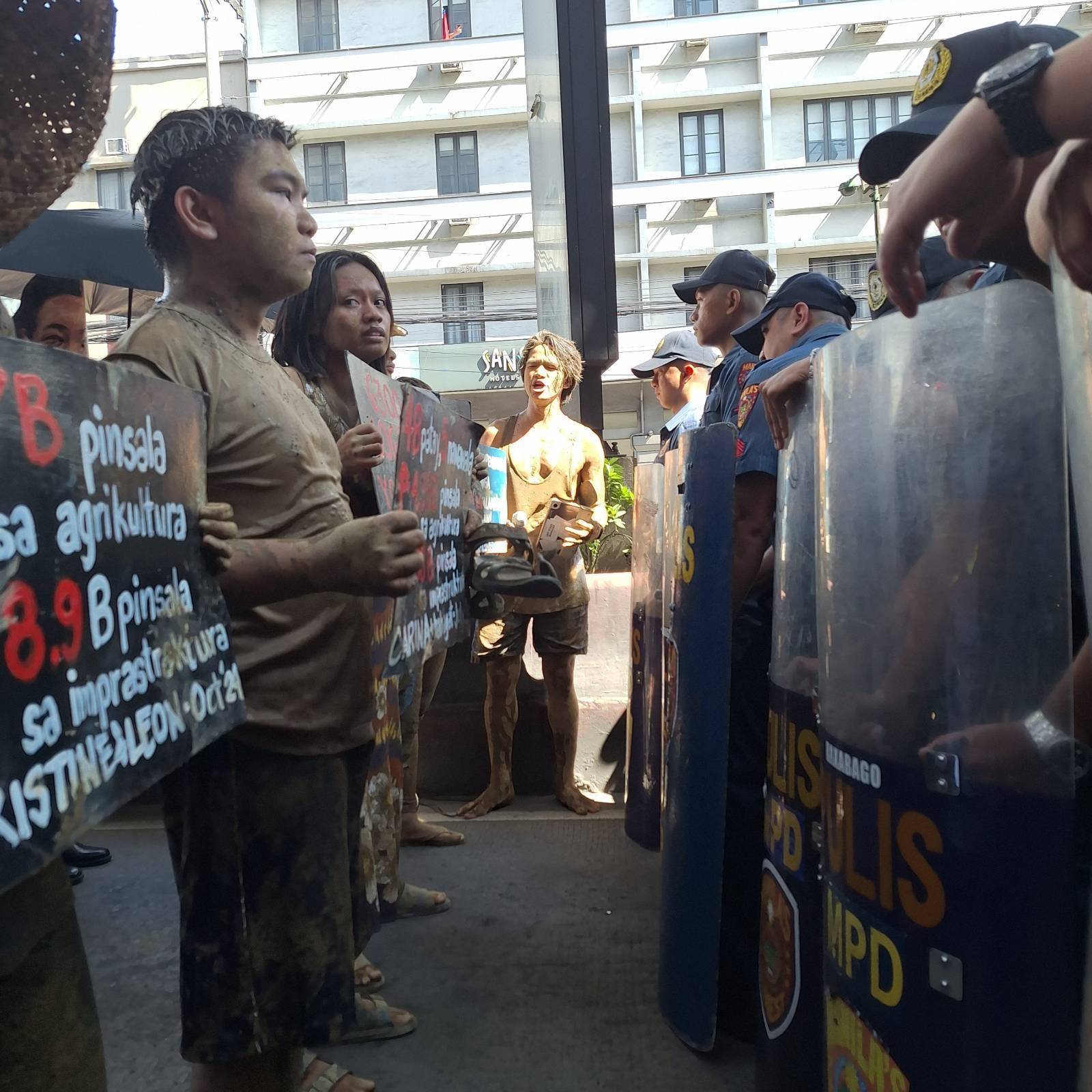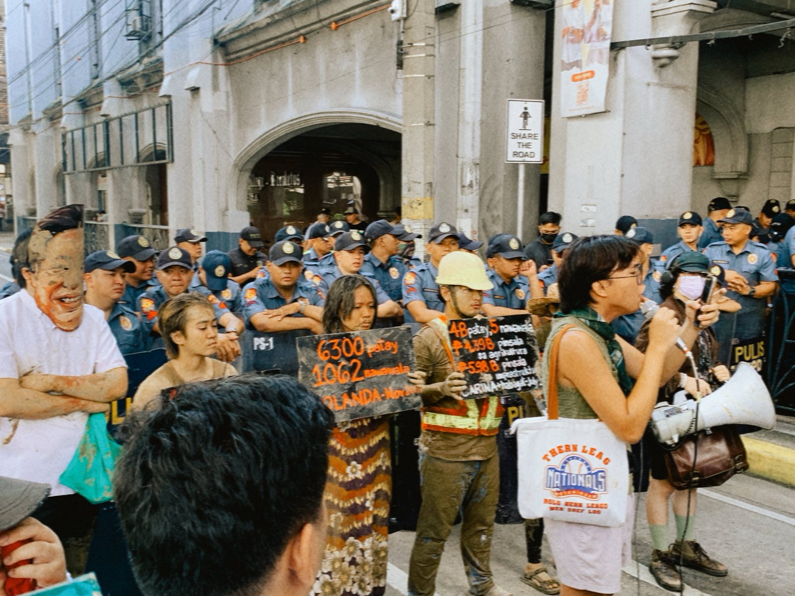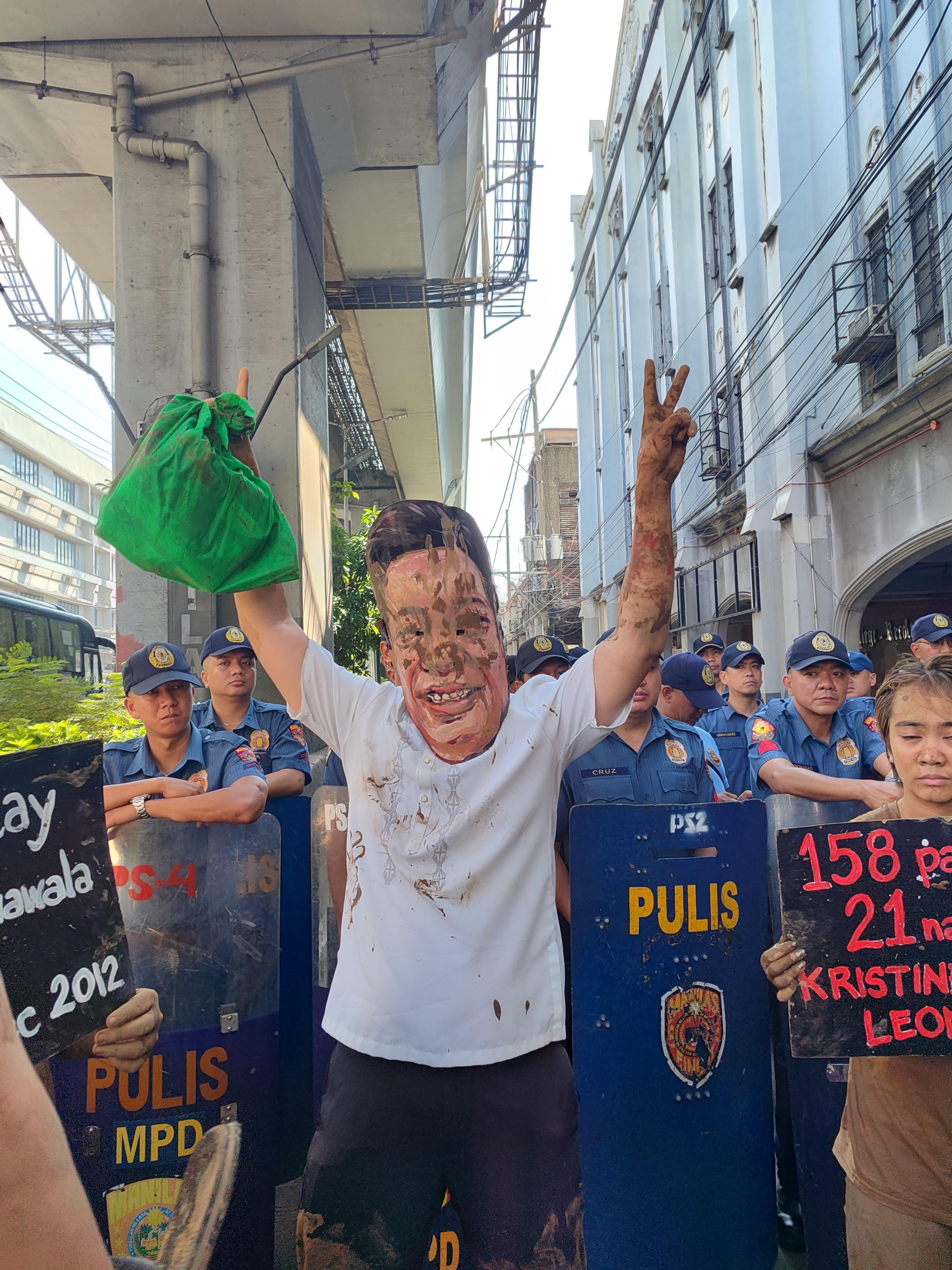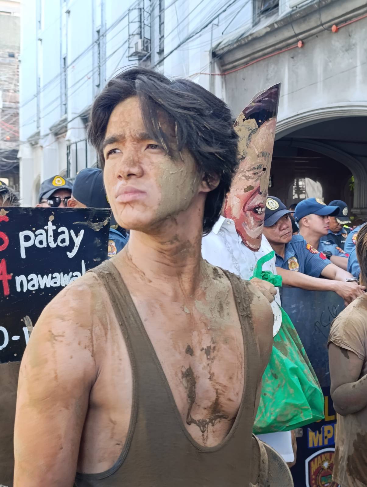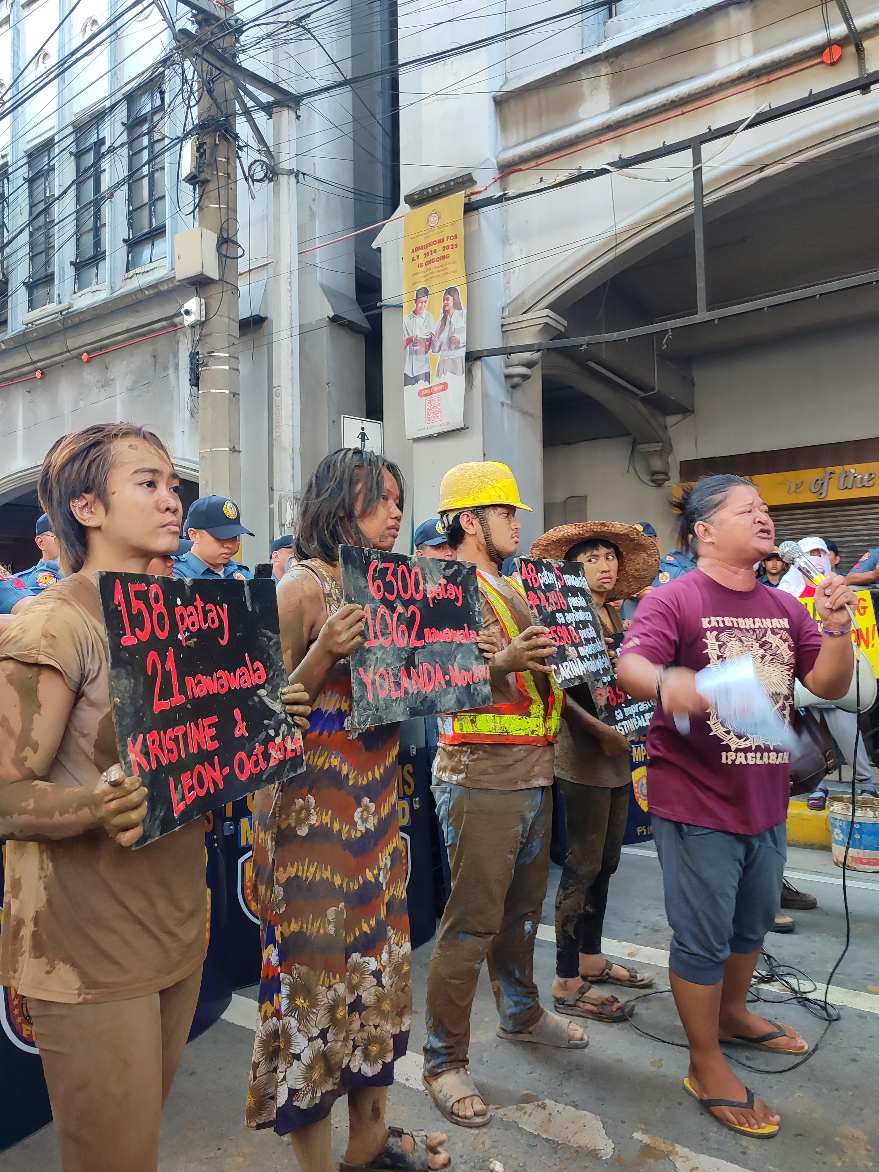To visualize their plight, disaster survivors drenched in mud walked the streets, coming after a Marcos, Jr. impersonator.